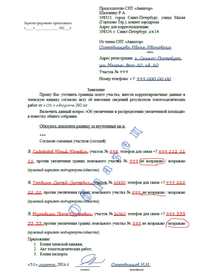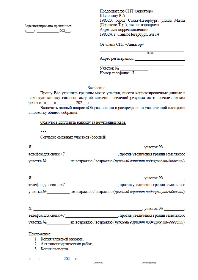 Заявление о вступлении в члены снт Авиатор